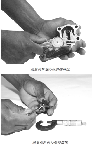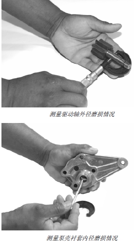3. 檢查泵殼和泵蓋軸孔內(nèi)徑和軸外徑。檢查齒輪是否摩擦泵蓋和泵殼。允許輕度摩擦。