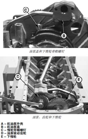 注意: 必須拆卸下部惰輪的帶帽螺釘 (C) 才能拆下機(jī)油泵殼體。