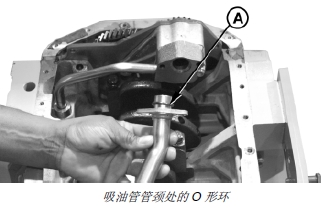 9. 在吸油管管頸處安裝新 O 形環(huán) (A)。安裝吸油管。(參見(jiàn)本章“拆卸、檢查和安裝油泵吸油管總成”部分。)
