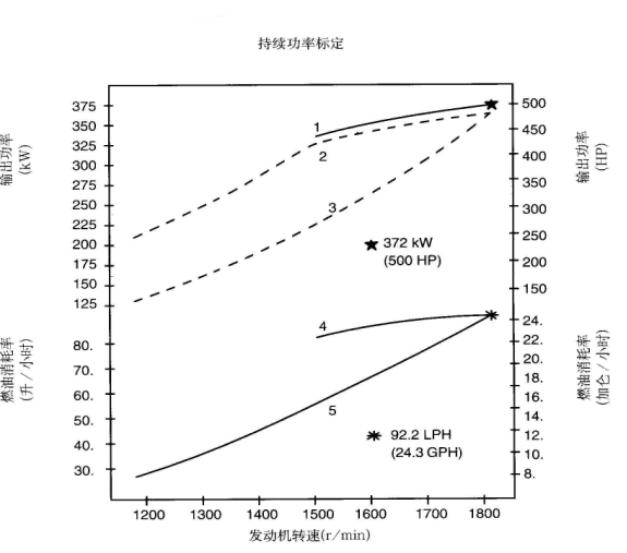 標(biāo)定條件:功率標(biāo)定是基于ISO8665標(biāo)準(zhǔn)規(guī)定的條件:大氣壓力為100kPa (29.612英寸汞柱),環(huán)境溫度為25℃(77°F),相對(duì)濕度為30%。螺旋槳軸功率為按97%扣除齒輪箱損失后的凈功率。燃油消耗是基于使用比重為838.9g/l(7.001磅/加侖),LHV為42780kJ/kW(18390Btu/lb)的35°API燃油。 1. 制動(dòng)功率 kW(HP) 4. 軸功率對(duì)應(yīng)的燃油消耗 2. 扣除齒輪箱損失后的軸功率 kW(HP) 5. 螺旋槳推進(jìn)曲線對(duì)應(yīng)的燃油消耗 3. 螺旋槳推進(jìn)曲線 持續(xù)功率:這種功率標(biāo)定的發(fā)動(dòng)機(jī)允許在全負(fù)荷工況下連續(xù)不斷地使用。這種功率為ISO3046標(biāo)準(zhǔn)功率 * 對(duì)非LTA發(fā)動(dòng)機(jī),其燃油耗高1-3%。 | ||||||