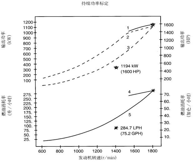 標(biāo)定條件:功率標(biāo)定是基于ISO8665標(biāo)準(zhǔn)規(guī)定的條件:大氣壓力為100kPa (29.612英寸汞柱),環(huán)境溫度為25℃(77°F),相對(duì)濕度為30%。螺旋槳軸功率為按97%扣除齒輪箱損失后的凈功率。燃油消耗是基于使用比重為838.9g/l(7.001磅/加侖),LHV為42780kJ/kW(18390Btu/lb)的35°API燃油。 1. 制動(dòng)功率 kW(HP) 4. 軸功率對(duì)應(yīng)的燃油消耗 2. 扣除齒輪箱損失后的軸功率 kW(HP) 5. 螺旋槳推進(jìn)曲線(xiàn)對(duì)應(yīng)的燃油消耗 3. 螺旋槳推進(jìn)曲線(xiàn) 持續(xù)功率:這種功率標(biāo)定的康明斯發(fā)動(dòng)機(jī)允許在全負(fù)荷工況下連續(xù)不斷地使用。這種功率為ISO3046標(biāo)準(zhǔn)功率 * 對(duì)非LTA康明斯發(fā)動(dòng)機(jī),其燃油耗高1-3%。 | ||||||