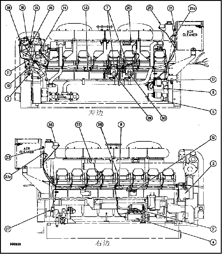 2.充電機 3.發(fā)動機電控器,4.預(yù)潤滑馬達, 5.起動馬達,6.起動馬達 7.電阻器,8.充電機斷路器.10.后冷卻器溫度傳感器.11.大氣壓力傳感器.12.曲軸箱壓力傳感器.13.發(fā)動機電控器(ECM)斷路器.14.發(fā)動機冷卻液溫度傳感器.15. 已過濾機油壓力傳感器.16. 未過濾機油壓力傳感器.17.發(fā)動機正時\轉(zhuǎn)速傳感器.18.燃油濾清器壓力傳感器(已過濾).19.燃油濾清器壓力傳感器(未過濾).20.左排氣溫度傳感器.21.左渦輪增壓進氣壓力傳感器.22.右排氣溫度傳感器.23.右渦輪增壓進氣壓力傳感器.24.渦輪增壓氣輸入壓力傳感器.25.空氣關(guān)斷電磁閥(左,選配件).26.空氣關(guān)斷電磁閥(右,選配件).28.噴油器電磁閥 29.輔助起動電磁閥.30.輔助起動電磁閥.31.預(yù)潤滑壓力開關(guān)(選配件).