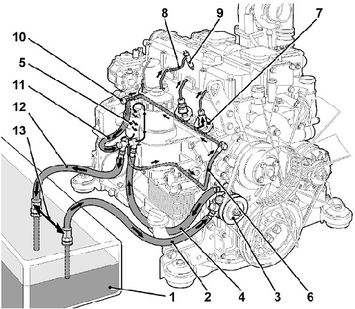 1 - 柴油箱 2 - 燃油進(jìn)油管 3 – 燃油輸油泵 4 – 濾清器前燃油管 5 – 燃油濾清器 6 –濾清器后燃油管 7 – 單體泵 8 – 高壓油管 9 – 噴油器 10 – 限壓閥 11 – 回油管 12 – 回油管 13 – 燃油箱內(nèi)進(jìn)回油管距離規(guī)定