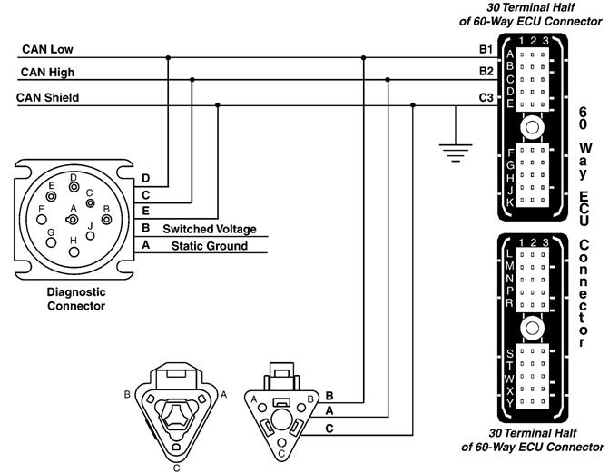 · Terminal D in the diagnostic connector and terminal B1 in the 60-way ECU connector · Terminal C in the diagnostic connector and terminal B2 in the 60-way ECU connector |