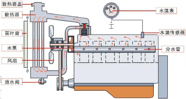 散熱器的進(jìn)水管與缸蓋水套相通,出水管通過(guò)水泵與缸體水套相通。發(fā)動(dòng)機(jī)運(yùn)轉(zhuǎn)時(shí),水泵將冷卻液在水套與散熱器之間進(jìn)行循環(huán),把發(fā)動(dòng)機(jī)水套內(nèi)高溫的冷卻液抽入散熱器進(jìn)行散熱,再將散熱后的低溫冷卻液送入水套繼續(xù)對(duì)發(fā)動(dòng)機(jī)進(jìn)行冷卻。