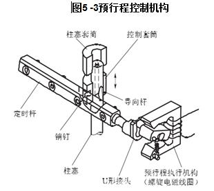 預(yù)行程控制機(jī)構(gòu),如圖5-3所示??刂铺淄苍趯?dǎo)向桿的引導(dǎo)下可上下移動,而控制套筒的上下移動是由預(yù)行程執(zhí)行機(jī)構(gòu)(螺旋電磁線圈)通過U形接頭轉(zhuǎn)動定時桿,并由其上的銷釘撥動控制套筒上下移動來改變預(yù)行程的。