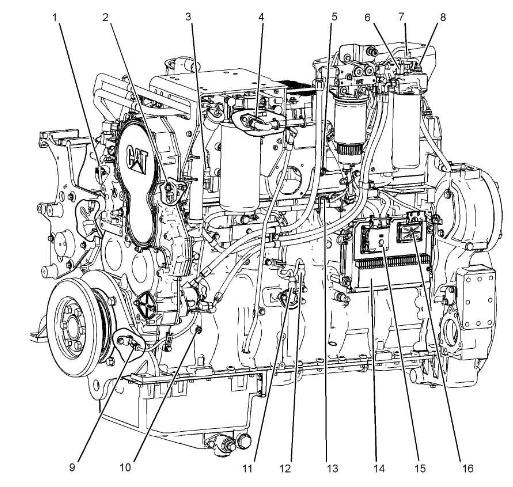 圖4發(fā)動機(jī)左側(cè)視圖(范例)(1) 發(fā)動機(jī)冷卻溫度傳感器(2) 次速度/時間感應(yīng)塞(3) 進(jìn)氣歧管壓力傳感器(4) 噴油器閥蓋進(jìn)口接頭(5) 進(jìn)氣歧管空氣溫度傳感器(6) 壓差開關(guān)(燃油)(7) 燃油壓力感應(yīng)塞(8) 燃油溫度傳感器(9)主速度/時間感應(yīng)塞(10) 正時校準(zhǔn)口(11) 大氣壓力感應(yīng)塞(12) 機(jī)油壓力感應(yīng)塞(13) 正時校準(zhǔn)探針接口(14) 發(fā)動機(jī)控制模塊(ECM)(15) J2/P2 ECM 接頭 (16) J1 ECM 接頭