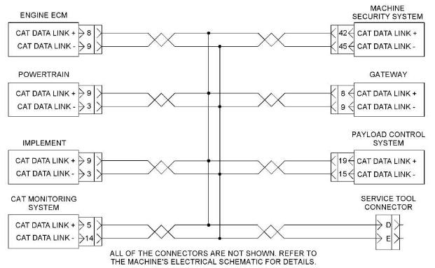 卡特?cái)?shù)據(jù)鏈路接線(xiàn)圖(范例)測(cè)試步驟 1.檢查電氣接頭和電線(xiàn)A.斷開(kāi)發(fā)動(dòng)機(jī)ECM的電源