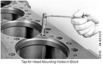 2. Remove cylinder head locating dowels, if not previously removed. Clean out all threaded holes for cylinder head mounting cap screws in top deck of cylinder block. Use JDG681 Tap or an equivalent 9/16-12 UNC-2A tap approximately 88.9 mm (3.5 in.)
