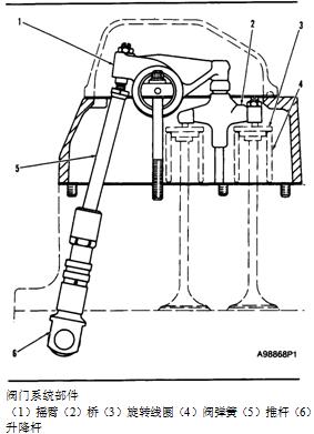 (1)搖臂(2)橋(3)旋轉(zhuǎn)線圈(4)閥彈簧(5)推桿(6)升降桿