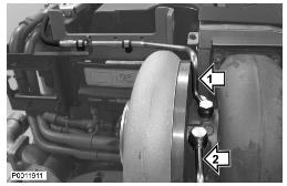 15 在沃爾沃渦輪增壓器中加注新的、干凈的發(fā)動(dòng)機(jī)機(jī)油并用新密封件安裝供油管(1)。用夾子將管線固定到發(fā)動(dòng)機(jī)吊眼上。用新密封件安裝新冷卻劑連接(2)。
