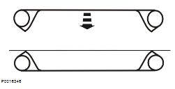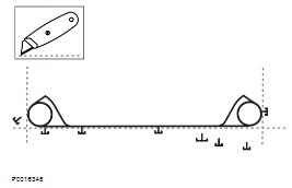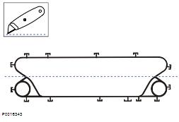 5 密封件必須使用沃爾沃遍達零件號 1161277 膠合。在兩半密封件相遇地方的上面和下面涂抹一層膠水。在圖示點涂抹膠水。擦去多余的膠水。安裝前等待 30 分鐘以上,以讓膠水干燥