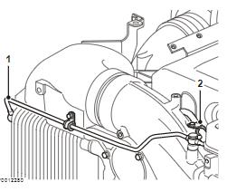 2 將volvo柴油發(fā)動(dòng)機(jī)增壓空氣冷卻器至膨脹箱之間的管路(1)。拆下增壓空氣管上的橡膠軟管夾(2)。