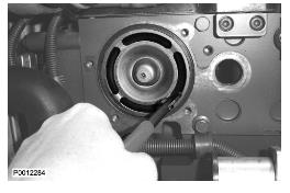 5 拆下將增壓空氣冷卻器固定到恒溫器蓋上的螺栓(1)。拆下恒溫器蓋螺栓并拆下恒溫器蓋。