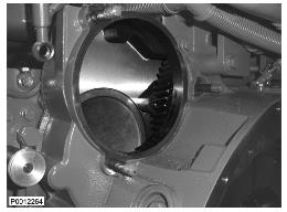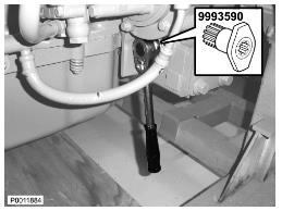 11 將泵提到合適的位置并用曲柄轉(zhuǎn)動(dòng)發(fā)動(dòng)機(jī)9993590 旋轉(zhuǎn)工具使正時(shí)齒輪與泵上的齒輪嚙合。緊固螺母。拆下工具并安裝保護(hù)蓋。