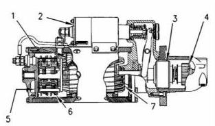 電磁閥(2)在空心氣缸周圍有繞組(一組或兩組)。彈簧加載的柱塞位于氣缸內(nèi)。柱塞可以前后移動。當啟動開關(guān)閉合,電流通過繞組輸送時,產(chǎn)生磁場(1)。磁場(1)將柱塞在氣缸中向前拉。這會移動換檔桿,使小齒輪驅(qū)動齒輪與齒圈接合。然后,柱塞前端通過電磁閥(2)的蓄電池和馬達端子進行接觸。接下來,起動馬達開始轉(zhuǎn)動發(fā)動機的飛輪。當起動開關(guān)打開時,電流不再流過繞組。彈簧現(xiàn)在將柱塞推回到原始位置。同時,彈簧使小齒輪遠離飛輪。