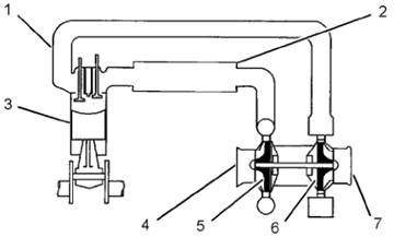 (1) 排氣岐管 (2)后冷器(3)發(fā)動(dòng)機(jī)氣缸 (4)進(jìn)氣口 (5)渦輪增壓器壓縮機(jī)葉輪(6)渦輪坩壓器堝輪葉鞋(7)排氣出口