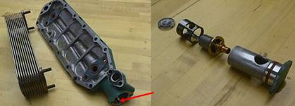 康明斯Cummins QSK23發(fā)動(dòng)機(jī)在每個(gè)機(jī)油濾清器內(nèi)都有一個(gè)旁通閥,設(shè)定開(kāi)啟壓力為 241 kp (35PSI).濾清器阻力過(guò)大時(shí),旁通閥前后壓差使其克服彈簧力開(kāi)啟。這使得機(jī)油旁通流過(guò)濾清器,向發(fā)動(dòng)機(jī)提供機(jī)油