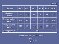 康明斯Cummins QSK23發(fā)動(dòng)機(jī)看另外一組數(shù)據(jù),我們先根據(jù)氣缸所在位置對(duì)每缸的測(cè)試數(shù)據(jù)進(jìn)行補(bǔ)償。下一步,計(jì)算平均值。最后,把每個(gè)缸的數(shù)據(jù)和平均值作對(duì)比。 在此例中,2號(hào)氣缸低于平均值超過(guò)20℃,被認(rèn)為是不正常的。