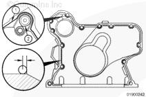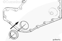 注: 安裝三個(gè)導(dǎo)向銷(xiāo)(零件號(hào) 3164977)以改進(jìn)前蓋和前油封與齒輪室和曲軸的對(duì)準(zhǔn)情況。
