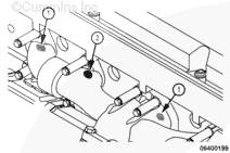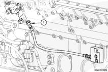 從位于發(fā)動機左排的回油歧管塊上拆下噴油器回油軟管。僅拆下回油歧管缸體端 (1) 的軟管。參考第 6 節(jié)中的步驟 006-013。