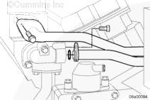 將密封墊和輸水接頭安裝到右排中冷器下部端口。安裝螺栓。扭矩值:  65  n.m  [48 ft-lb]