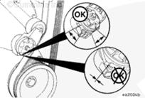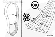檢查皮帶張緊器皮帶輪上傳動(dòng)皮帶的位置。皮帶應(yīng)位于皮帶輪的中間,或靠近中間。未對(duì)準(zhǔn)的皮帶、無論太靠前或太靠后,都可能造成皮帶磨損、皮帶滾動(dòng)故障或增加不均勻的張緊器襯套磨損。
