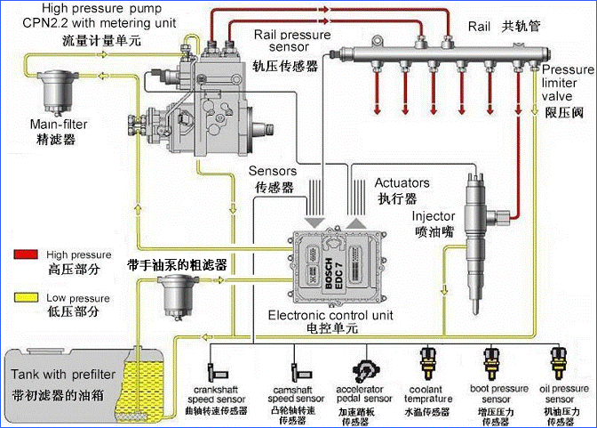 共軌系統(tǒng)對燃油油路要求較高,低壓油路(油箱 粗濾  精濾,回油)、高壓油路(高壓油泵  共軌高壓油管  噴油器)都要保證密閉。任何一個環(huán)節(jié)出了問題,軌壓都不能正常建立,提示主機廠對整個燃油油路高度重視。