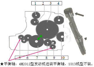 1.調(diào)速器驅(qū)動齒輪,2.惰輪,3.凸輪軸齒輪,4.液壓泵齒輪,5.平衡軸齒輪,6.惰輪,7.曲軸齒輪,8.惰輪,9.平衡軸齒輪,10.壓縮機齒輪,