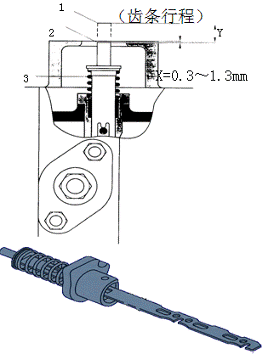 整機(jī)采用一根供油齒條安裝在缸體上,齒條的伸縮量Y應(yīng)在16.8~17.1mm的范圍內(nèi)以保證噴油泵的油量。齒條處在停車位置時(shí)應(yīng)在殼體之后0.3~1.3mm。當(dāng)更換齒條或調(diào)速器時(shí),應(yīng)測(cè)量這個(gè)值。