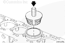 如圖使用兩個(gè)(2)缸蓋螺栓并定位兩個(gè)(2)缸套卡箍(零件號(hào) 3822503)。擰緊螺栓。扭矩值: 68 n.m [50 ft-lb]拆下缸套壓板并重復(fù)本步驟,直到所有缸套已被壓緊和釋放。