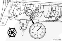 注: 連桿必須能夠在曲軸軸頸上橫向移動自如。如果連桿不能移動自如,拆下連桿蓋,然后確保軸瓦的尺寸正確。檢查曲軸和軸瓦上有無污垢或損壞。