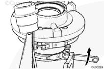 若要安裝渦輪殼,在軸承座上定位 v 形帶箍,對齊在拆解期間所做的墨水標記。