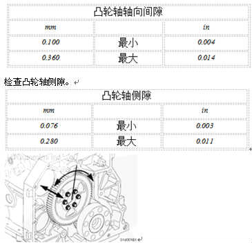 使用量規(guī)(零件號 3824564)和磁性底座(零件號 3377399),核實凸輪軸軸向間隙。