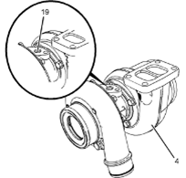 12.從進(jìn)油口(19)處拆下螺塞。請參閱插圖54。用清潔的發(fā)動機(jī)機(jī)油通過進(jìn)油口潤滑Perkins1106A/C發(fā)動機(jī)渦輪增壓器軸承。將壓縮機(jī)葉輪轉(zhuǎn)動幾次以便潤滑軸承。