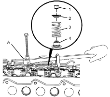 b.使用工具(A),壓縮Perkins1106A/C發(fā)動(dòng)機(jī)氣門(mén)彈簧(3)并使氣門(mén)稍稍開(kāi)啟。