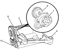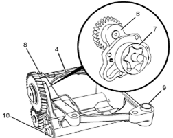 4如有必要,從Perkins1106A/C發(fā)動機(jī)機(jī)油泵的前蓋組件(6)上卸下螺栓(10)。從Perkins1106A/C發(fā)動機(jī)機(jī)油泵(4)上卸下前蓋組件(6)。