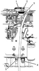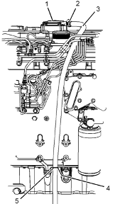 3從Perkins1106A/C發(fā)動機(jī)氣門機(jī)構(gòu)蓋(1)和Perkins1106A/C發(fā)動機(jī)曲軸箱呼吸器的濾清器座(5)上拆下軟管(3)。