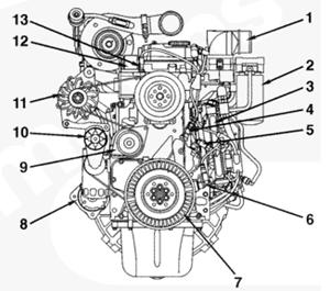1進(jìn)氣接頭,2燃油濾清器 3發(fā)動(dòng)機(jī)控制模塊 (ECM) 4機(jī)油壓力傳感器 5凸輪軸轉(zhuǎn)速/位置傳感器 6曲軸轉(zhuǎn)速/位置傳感器 7減振器 8起動(dòng)馬達(dá) 9水泵 10皮帶張緊器 11充電機(jī) 12出水口接頭 13冷卻液溫度傳感器。