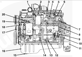 1燃油濾清器 2燃油濾清器座 3濾清器支架 4燃油連接塊接頭 5燃油油軌 6燃油油軌壓力傳感器 7從高壓泵、噴油器和燃油8油軌至燃油連接塊的回油 9附件驅(qū)動(dòng)裝置蓋 10燃油泵 11高壓供油管(泵至油軌) 12飛輪殼 13從齒輪泵至燃油濾清器的燃油供應(yīng) 14從燃油濾清器至高壓泵的燃油供應(yīng) 15機(jī)油油位計(jì)管 16放油塞 17油底殼 18風(fēng)扇驅(qū)動(dòng)皮帶 19ECM 20ECM 支架