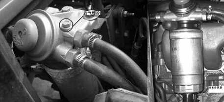排放燃油系統(tǒng)中的空氣時(shí),應(yīng)該先旋轉(zhuǎn)燃油濾清器頂部的放氣螺栓(上圖所示),將其松開,按壓手油泵,直到從放氣孔中流出無(wú)空氣的燃油。緊固放氣螺塞,手油泵集成在濾清器上端。