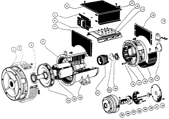 1—前端蓋;2—出風蓋板;3—軸承;4—定子;5—端子箱側板;6—電壓調節(jié)器;7—調節(jié)器支架;8—端子箱頂蓋;9—端子箱前后板;10—接線板;11—接線板支架;12—端子箱側板;13—吊攀;14—軸承蓋;15—進風蓋板;16—后端蓋;17—勵磁定子;18—勵磁定子固定螺栓;19—軸承;20—旋轉整流器;21—勵磁電樞;22—接地牌;23—轉子;24—風扇;25—永磁機機殼;26—永磁機轉軸;27—永磁機轉子;28—永磁機定子;29—永磁機定子固定螺栓;30—永磁機轉子固定螺栓;31—墊圈;32—永磁機蓋板