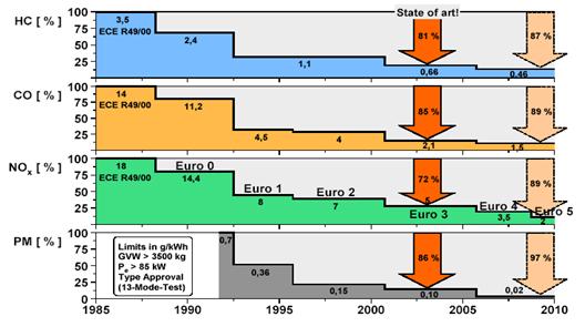 2 、為滿足排放法規(guī)所采用的技術(shù) 歐洲1號和2號標(biāo)準(zhǔn):使用機械控制噴油系統(tǒng)即可達(dá)標(biāo)。歐洲3號標(biāo)準(zhǔn):必須使用電子控制噴油系統(tǒng)。共軌式系統(tǒng)、電控單體泵,電控泵噴嘴系統(tǒng),蓄壓增壓電噴系統(tǒng)(HEUI)和直列泵分配泵電控系統(tǒng)能夠滿足這個標(biāo)準(zhǔn)。