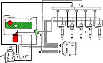 1=電動輸油泵2=燃油濾清器3=回油閥4=回油儲存器5=CP1 高壓泵6=高壓控制閥7=共管壓力傳感器 (RPS)8=共管